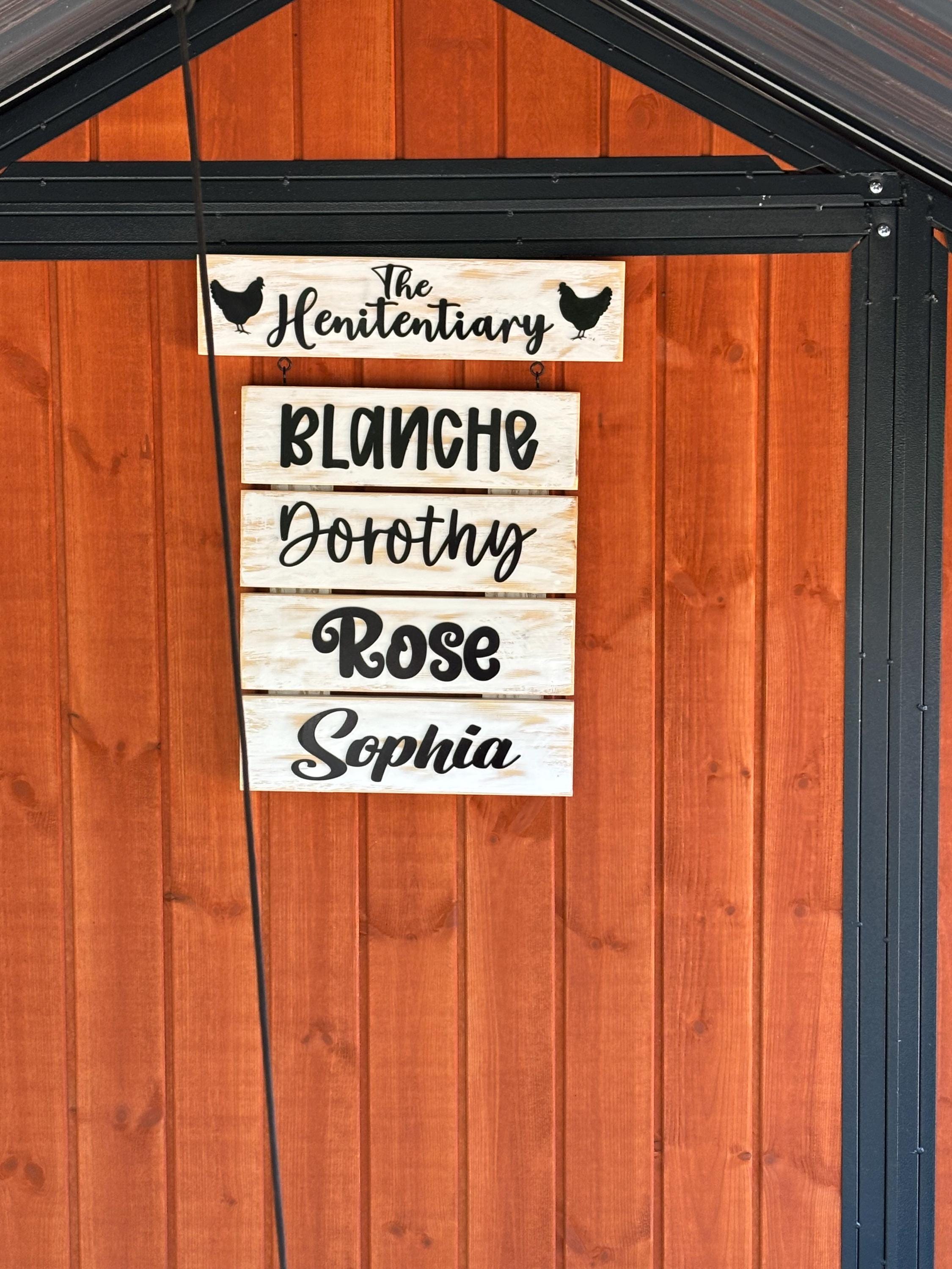 Adorn your chicken coop with charming rustic style with this handmade wooden sign. Crafted with a black stain finish or natural wood and accented with white chalk paint, this personalized sign will add a touch of farmhouse character to your coop. Names are cut out of black acrylic and sealed for weather to promote a longer lasting sign. Perfect for displaying your coop's name and greeting visitors with a warm welcome. Hang this unique piece with pride and watch as it adds a delightful touch to your backyard space. Ideal for any chicken enthusiast or farm lover looking to add a touch of whimsy to their outdoor decor.