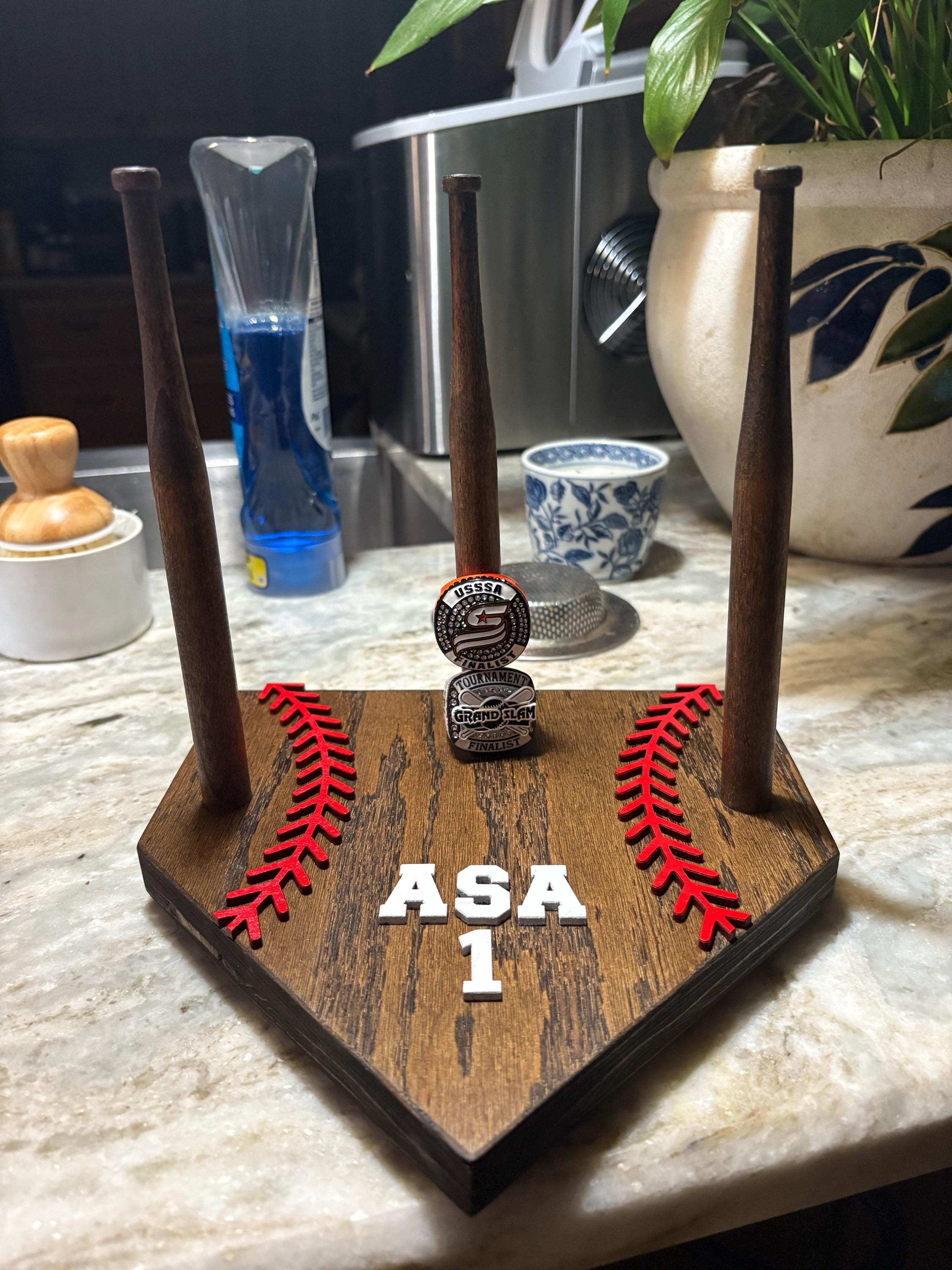 This personalized wooden baseball ring holder is perfect for showing off your championship and tournament rings. Shaped like a home plate with bat-style posts, it’s both functional and a keepsake.